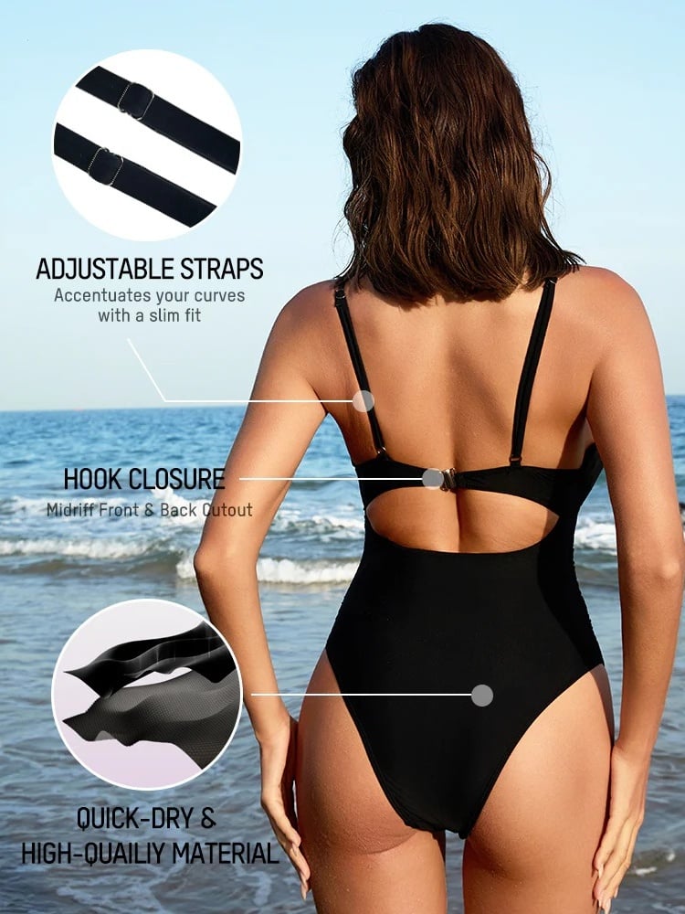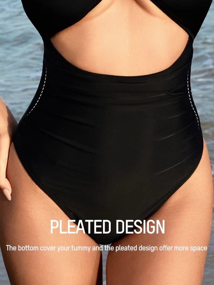 The midriff cutout in the front and back and cheeky bottom creat a sexy style, while the high waist and ruched design finish the slimming swimsuits